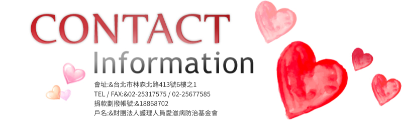 歡迎您來到 「財團法人護理人員愛滋病防治基金會」,若有任何問題,可以與本基金會聯絡或使用下列表單向我們反映,我們將會在最短的時間內回覆您的來信!